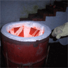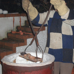 geschmolzen ist) mit Zangen aus dem Ofen herausgeholt.
